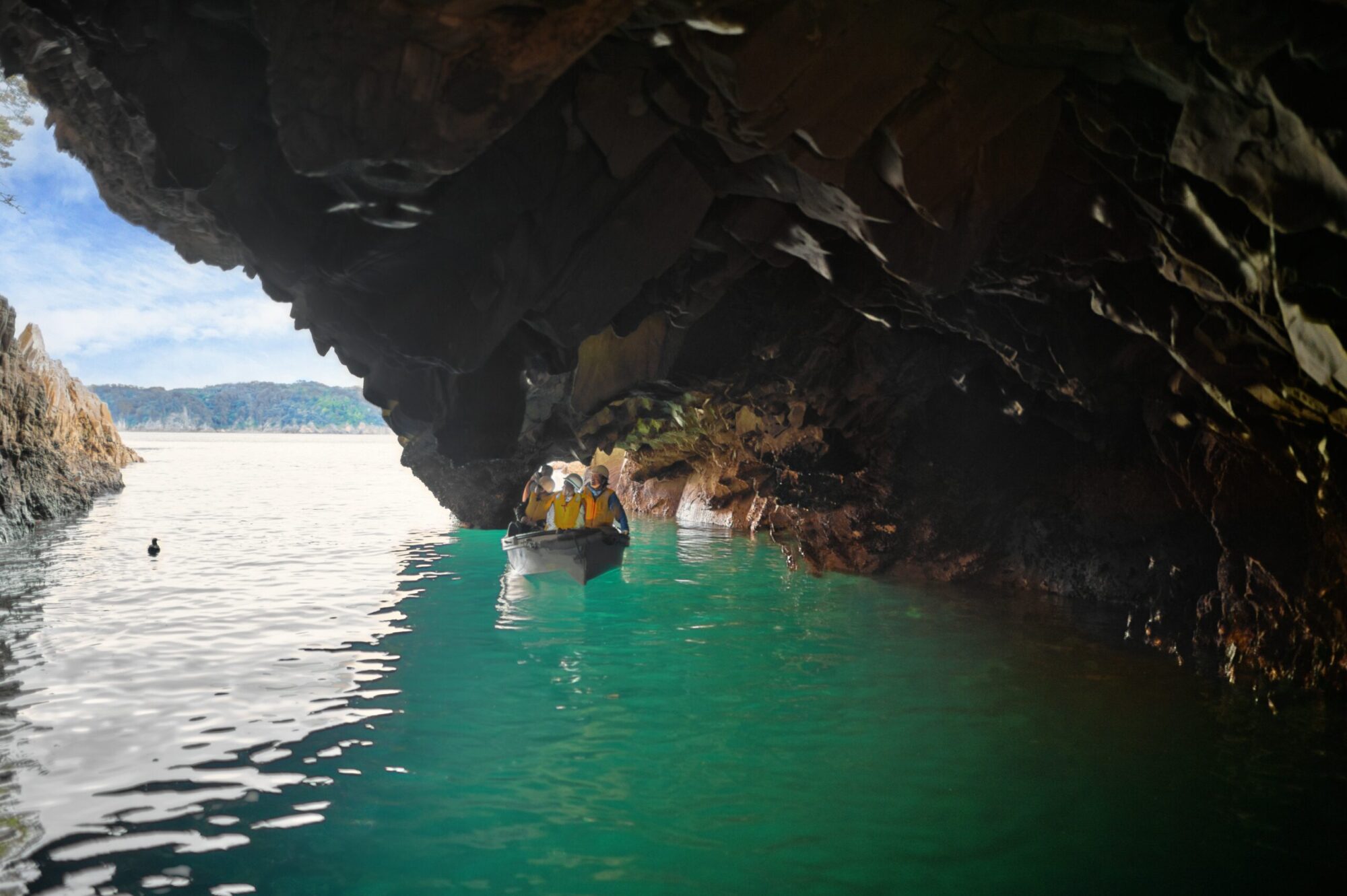 浄土ヶ浜の内湾を巡るさっぱ船遊覧では、神秘的な青の洞窟「八戸穴」が見どころです。洞窟内に差し込む光で水面が深く青く輝き、幻想的な景色が広がります。船上からは、リアス海岸の美しい岩肌や海の景観を間近で楽しめ、写真撮影にも最適です。光と水の神秘的な演出は、訪れる人に感動を与え、縁起の良い体験としても人気の観光スポットです。
